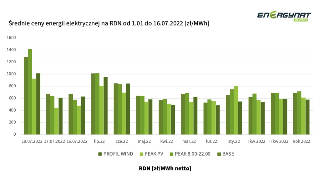 Na podstawie danych udostępnianych przez PSE oraz TGE, średnie ceny dla profilu PV (zielone pole – PEAK PV) w 2022 roku kształtowały się tak, jak na poniżej przedstawionych poziomach: